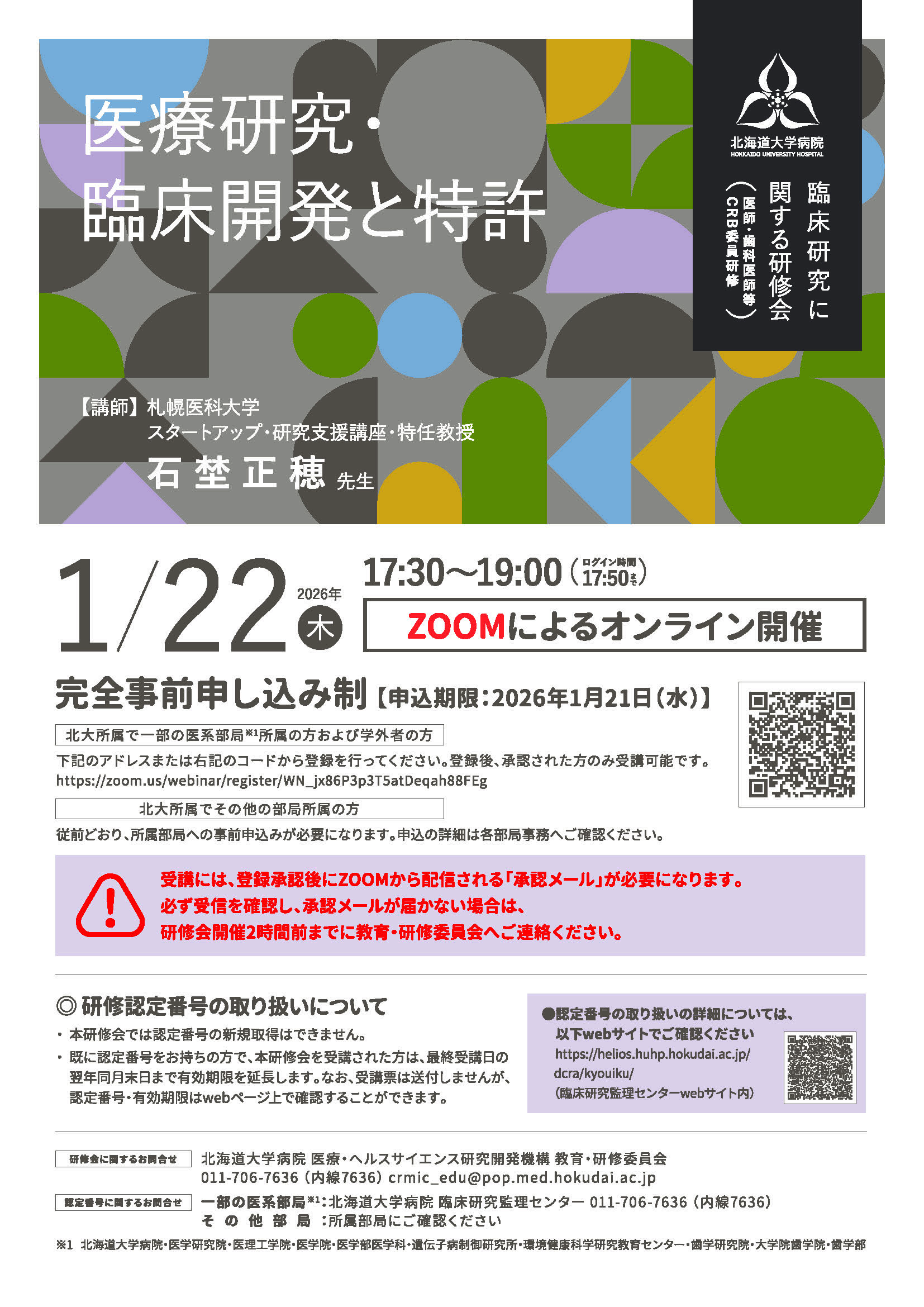 - 今回の北海道大学病院 臨床研究に関する研修会では、「医療研究・臨床開発と特許」というテーマで、その分野の専門家による講演会を開催します。このテーマは、PMやStMの業務を遂行するあたり重要であると考えられるため、認定を受けるべき対象者の育成や教育に資すると考えます。