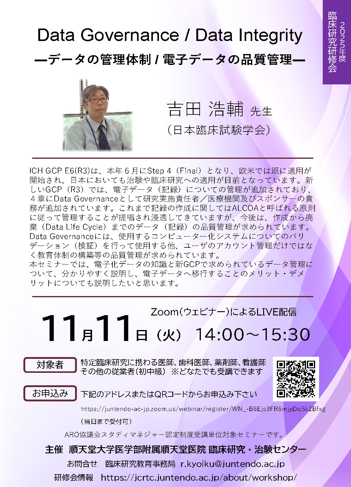 - 本セミナーは、医師、歯科医師等の臨床研究を行う方に限らず、研究・医薬品開発に携わる研究支援者の方々も含めた内容となっております。今回は電子データの管理体制と品質管理をテーマとした内容となっております。