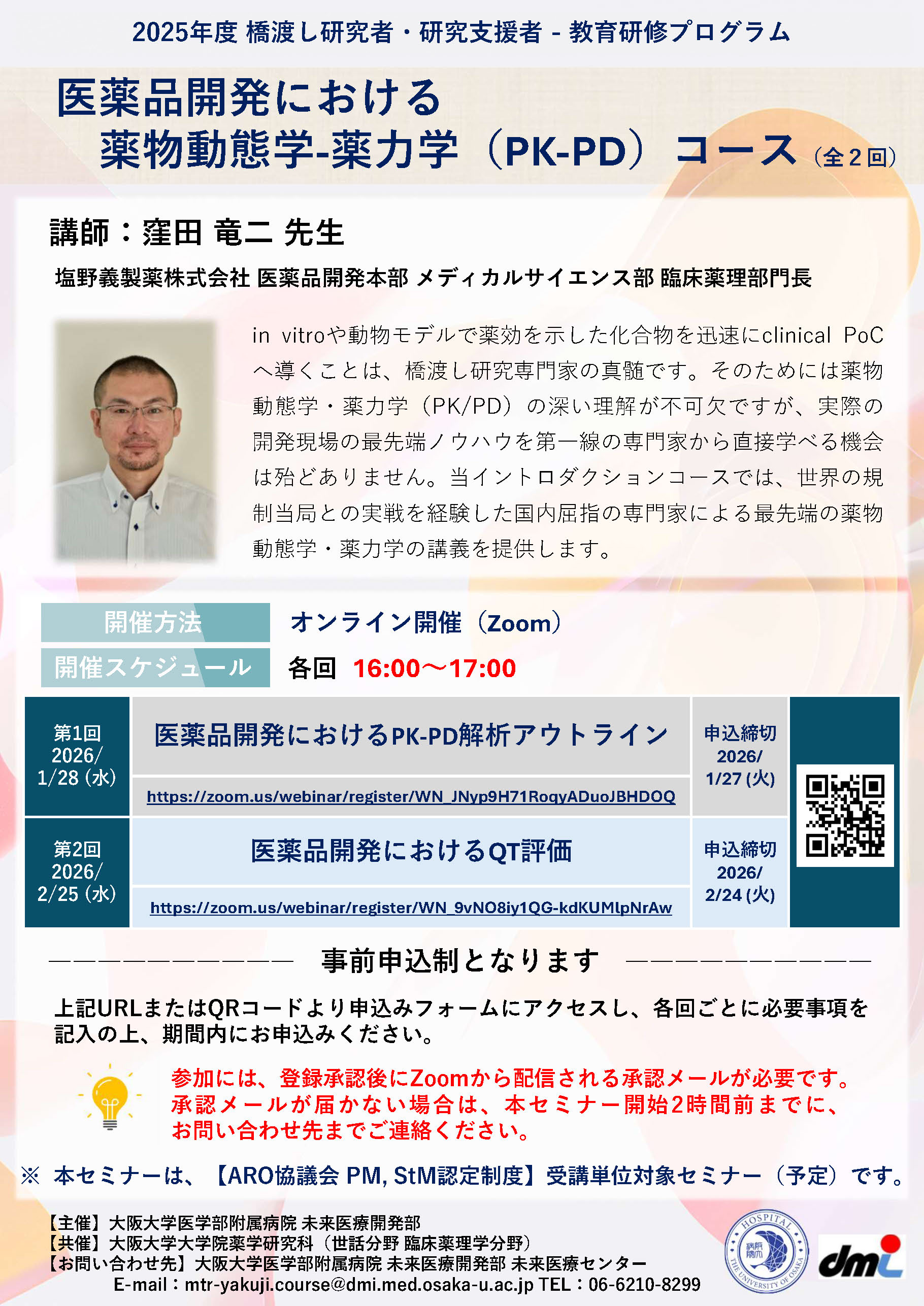 - 2025年度 橋渡し研究者・研究支援者 - 教育研修プログラムの一環として、アカデミアにおける橋渡し研究の研究者・PM・StM等に薬事規制・開発に関して複数の観点を集学的に概括するイントロダクションのセミナーを実施する。今回のコースは、実際の医薬品開発の最先端の薬物動態学・薬力学PK-PDに基づき、in vitro/動物モデルで薬効を示した化合物のclinical-PoC取得を考える講義です。