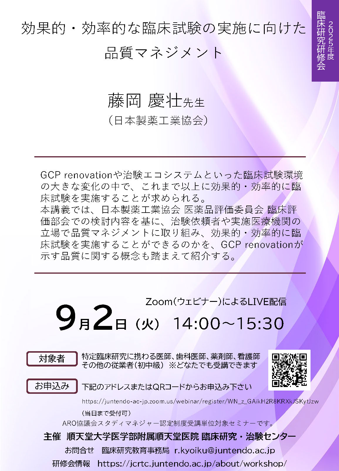 - 本セミナーは、医師、歯科医師等の臨床研究を行う方に限らず、研究・医薬品開発に携わる研究支援者の方々も含めた内容となっております。
